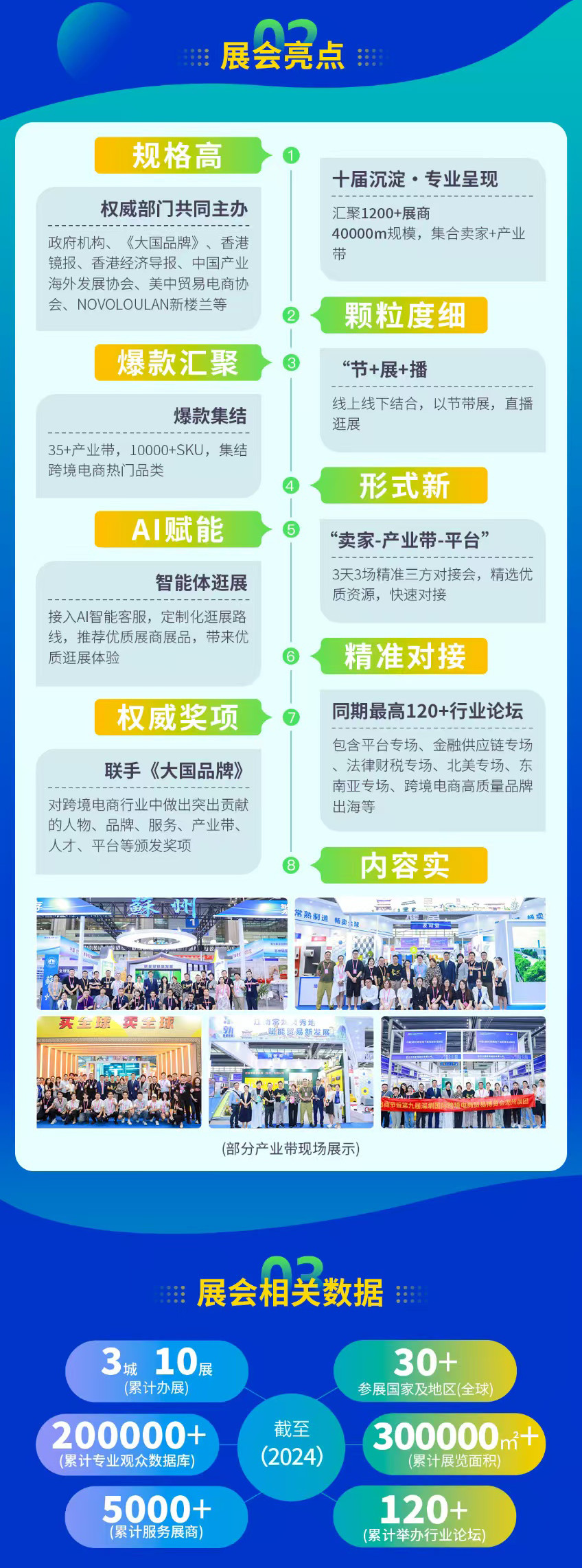 616全球跨境電商節暨深圳國際跨境電商貿易博覽會(簡稱:跨博會)是由深圳市政府批準,深圳市跨境電子商務協會主辦的全球跨境電商行業年度盛會。至今8載,累計展覽規模達到300000㎡,參展國家和地區30+個,累計吸引行業觀眾20萬+人參觀,帶動國內外5000多家跨境電商全產業鏈條品牌企業參展。跨博會作為廣東省會展baiqiang項目,為期3天展會從AI智能、大賣直通、智能智造、綠色平臺、跨境財稅、知識產權、跨境物流、海外倉儲、金融支付、平臺科技等多維度展示跨境電商全行業最新穎的商業模式、最dingjian的服務能力 以及最前沿的行業技術,全鏈條、高規格、一站式地展示跨境電商新質生產力。